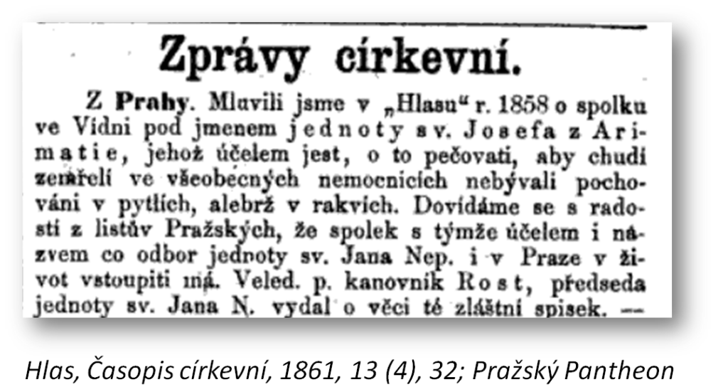Antonín Rost pocházel ze zbožné rodiny a brzy se rozhodl, že bude vysvěcen na kněze a poté bude studovat teologii v Innsbrucku. Po získání doktorátu v roce 1838 byl kantorem na univerzitě v Innsbrucku, následně ředitelem kněžského semináře v Praze. V roce 1848 Rosta opustil Prahu a zastával funkci ve staroboleslavské kapitule. V roce 1853 se Rosta stal administrátorem našeho kostela sv. Jana Nepomuckého na Skalce. Všiml si, že sousední nemocnice každý den vyhazuje chudé mrtvé v pytlích do hromadné šachty. Proto v roce 1861 založil po vzoru Vídně neziskovou organizaci „Spolek sv. Josefa z Arimatie“, jejím úkolem bylo zajistit pro chudé zemřelé rubáše i rakve a doprovázet je důstojně oděné na hřbitov. Za půl století její činnosti bylo zorganizováno přes 60 000 důstojných pohřbů těch nejchudších.